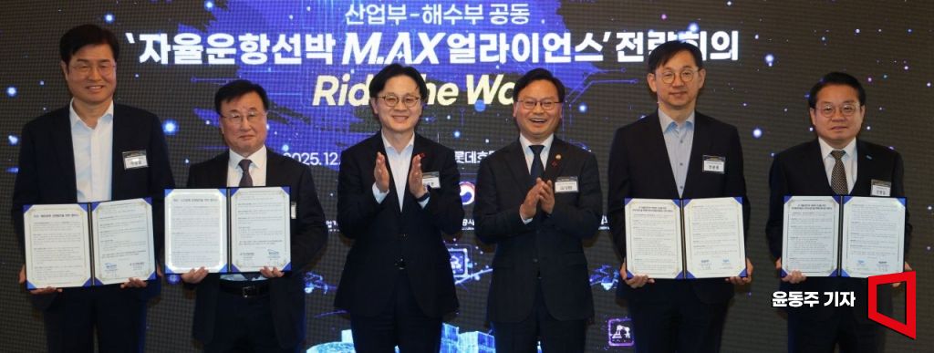 29일 서울 중구 롯데호텔에서 열린 산업부-해수부 공동 자율운항선박 M.AX 얼라이언스 전략회의에서 김정관 산업통상부 장관(왼쪽에서 세번째)과 김성범 해양수산부 장관 직무대행 등 참석자들이 업무협약서에 서명 후 기념촬영을 하고 있다.
