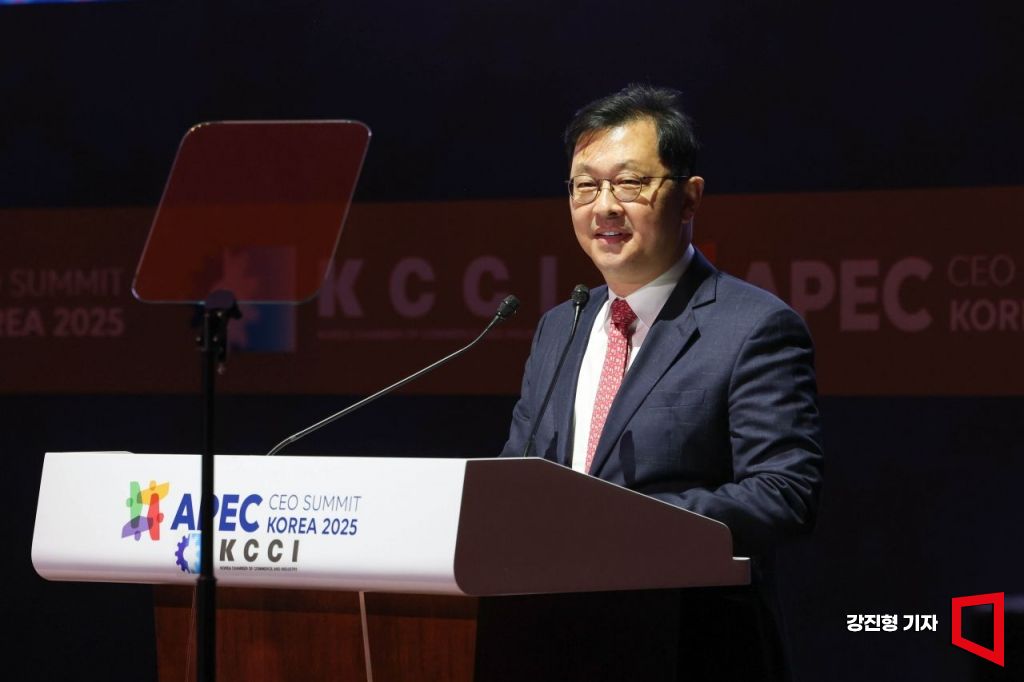 최재원 SK그룹 부회장이 지난 10월31일 오전 경북 경주 예술의전당에서 ‘아시아 태평양 LNG 협력’을 주제로 열린 아시아태평양경제협력체(APEC) 최고경영자(CEO) 서밋(Summit)에서 환영사를 하고 있다. 2025.10.31 강진형 기자