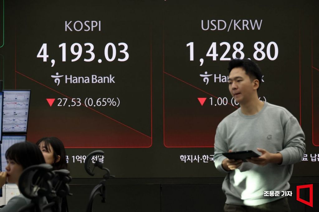 코스피가 2025년 마지막 거래일인 30일 하락출발한 가운데 서울 중구 하나은행 본점 딜링룸 현황판에 코스피가 표시돼 있다. 코스피는 전장보다 26.81포인트(0.64%) 내린 4193.75로 시작해 낙폭을 줄이고 있다.