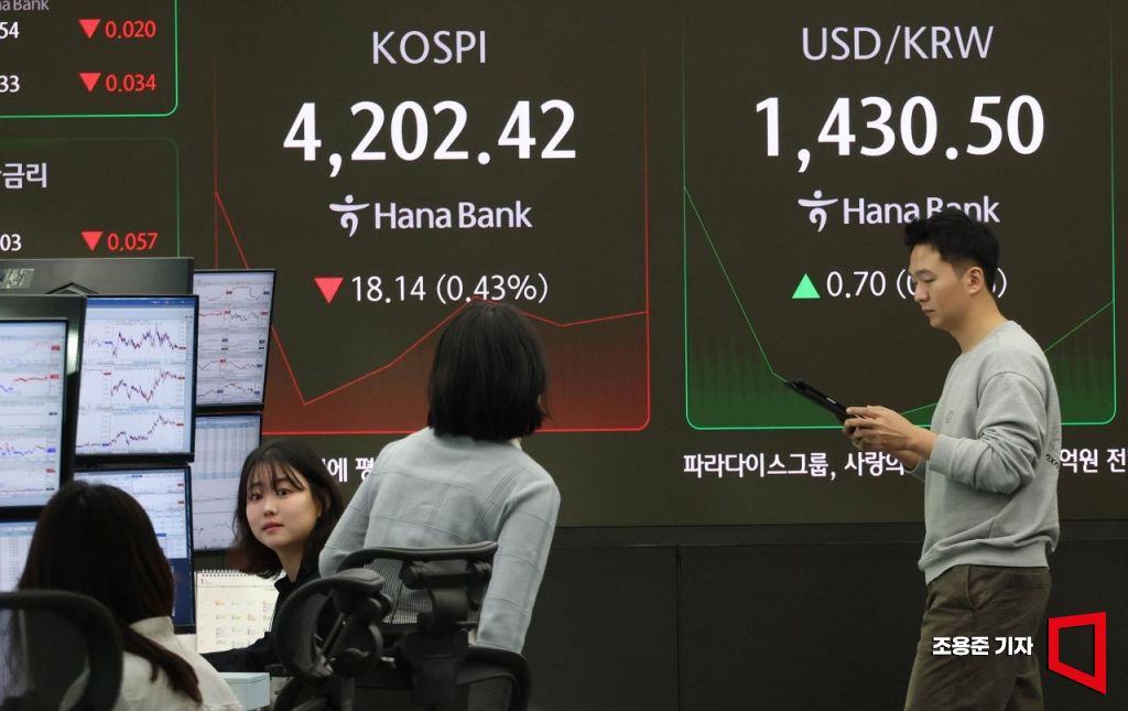 코스피가 2025년 마지막 거래일인 30일 하락출발한 가운데 서울 중구 하나은행 본점 딜링룸 현황판에 코스피가 표시돼 있다. 코스피는 전장보다 26.81포인트(0.64%) 내린 4193.75로 시작해 낙폭을 줄이고 있다.
