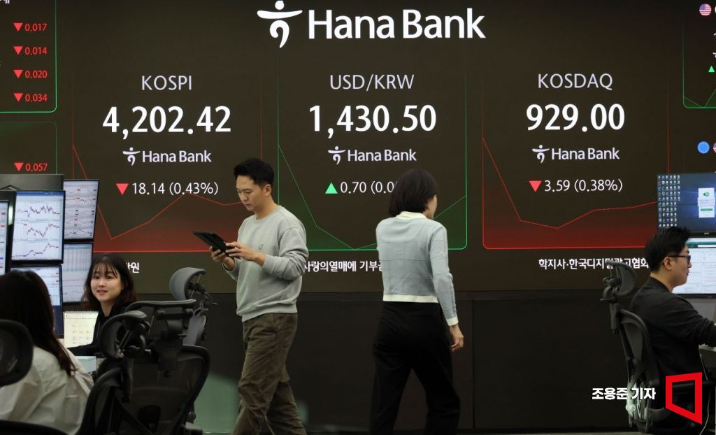 코스피가 2025년 마지막 거래일인 30일 하락출발한 가운데 서울 중구 하나은행 본점 딜링룸 현황판에 코스피가 표시돼 있다. 코스피는 전장보다 26.81포인트(0.64%) 내린 4193.75로 시작해 낙폭을 줄이고 있다.