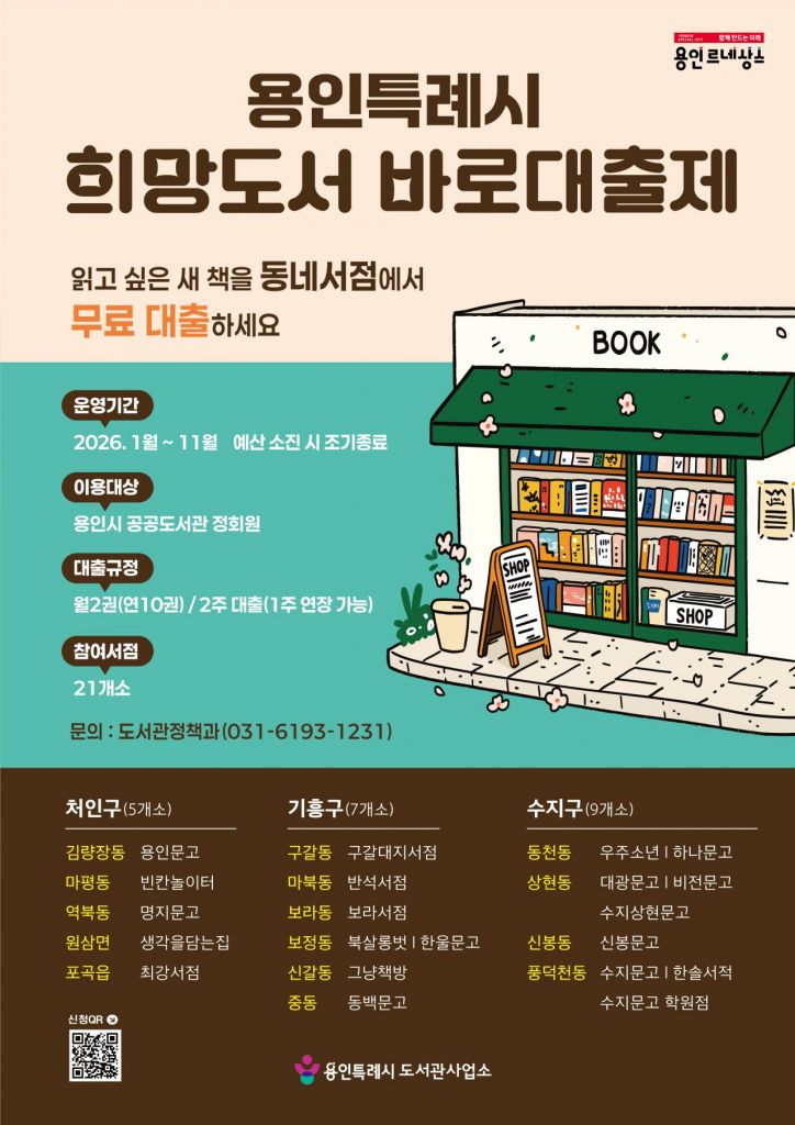 이 제도는 이용자가 도서관이 소장하지 않은 도서를 신청하면, 지역 서점에서 바로 대출해 이용할 수 있도록 하는 서비스다. 용인시 도서관 정회원이라면 누구나 지역 내 서점에서 신간을 신청해 빌려볼 수 있다.