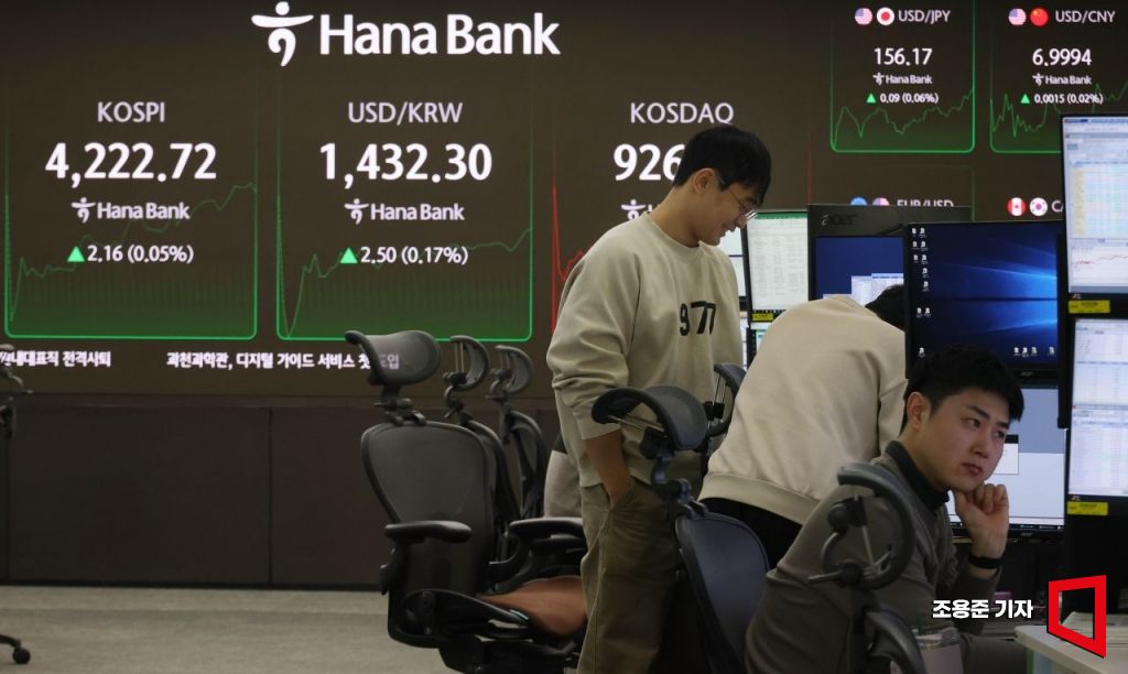 코스피가 올해 마지막 거래일인 30일 하락 출발 했으나 낙폭을 줄이며 반등하고 있는 가운데 서울 중구 하나은행 본점 딜링룸 현황판에 코스피, 원/달러 환율이 표시돼 있다. 코스피는 전장 대비 26.81포인트(0.64%) 내린 4,193.75로 출발한 뒤 낙폭을 줄여가고 있다. 코스닥은 3.85포인트(0.41%) 떨어진 928.74다. 원/달러 환율은 3.7원 오른 1,433.5원이다.