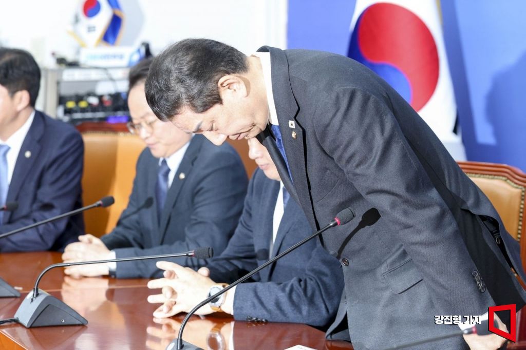 김병기 더불어민주당 원내대표가 30일 서울 여의도 국회에서 열린 원내대책회의에서 원내대표직 사퇴 입장을 밝힌 뒤 인사하고 있다. 2025.12.30 강진형 기자