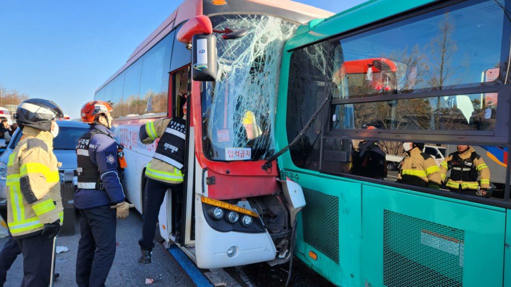 서울 강동소방서는 30일 오후 1시께 강동구 길동 생태공원 앞 교차로 사거리에서 버스 3대와 SUV 1대가 추돌하는 사고가 발생했다고 밝혔다.