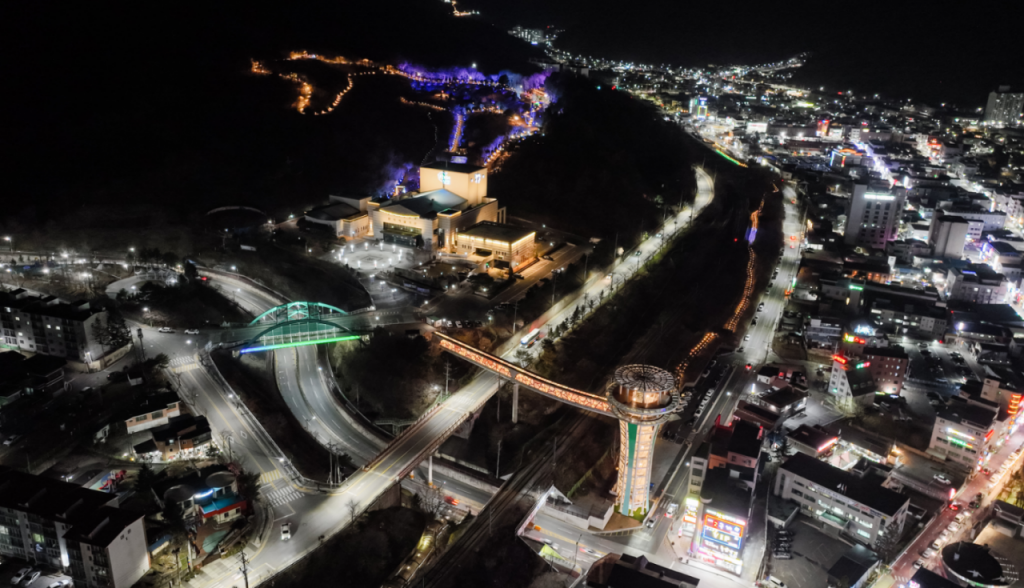 태백 타워 브릿지는 도심 중심부에서 관광지 일대를 조망할 수 있는 전망대와 황지연못·황부자며느리공원 일대를 연결하는 복합 보행시설로, 그간 단절되어 있던 문화·관광 자원을 하나의 보행 동선으로 묶어 접근성을 높이기 위해 조성됐다.