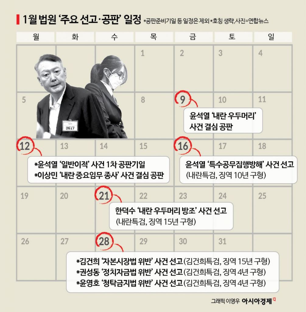 윤 전 대통령 사건뿐 아니라 계엄·특검 수사와 맞물린 주요 피고인들의 선고와 결심 공판도 이어질 예정이다. 1월 12일에는 언론사 단전·단수를 지시한 혐의를 받는 이상민 전 행정안전부 장관의 결심 공판, 21일에는 한덕수 전 국무총리의 내란 우두머리 방조 등 혐의 사건 선고가 예정돼 있다. 28일에는 도이치모터스 주가조작 혐의 등으로 구속기소 된 김건희 여사 함께 권성동 국민의힘 의원과 윤영호 전 통일교 세계본부장에 대한 선고도 각각 잡혀 있다.
