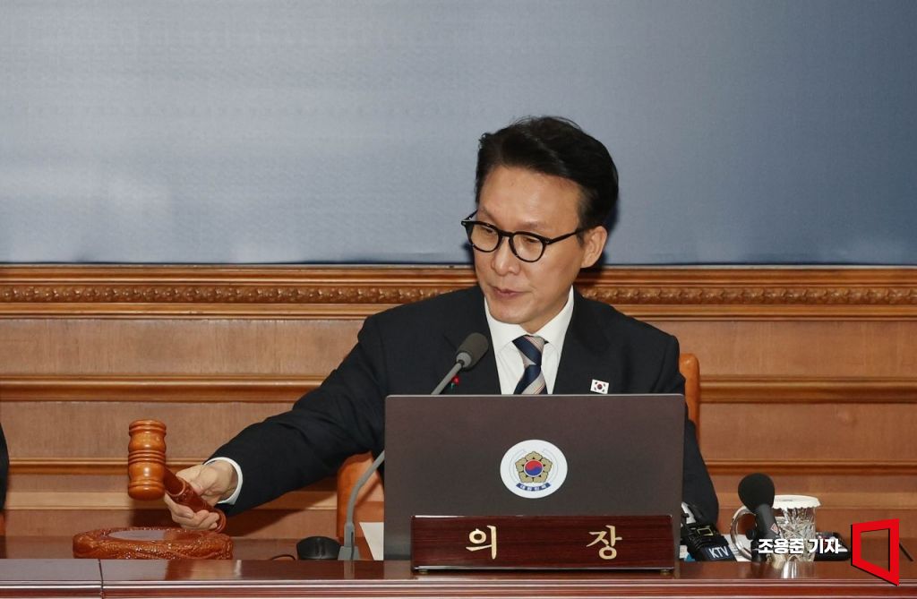 김민석 국무총리가 31일 서울 종로구 정부서울청사에서 열린 임시국무회의에 참석, 의사봉을 두드리고 있다.
