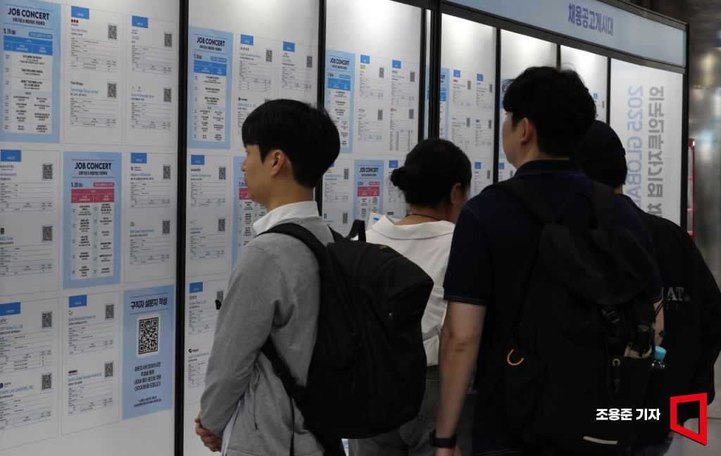 서울 강남구 삼성동 코엑스에서 열린 '2025 글로벌 탤런트 페어'(Global Talent Fair)' 를 찾은 취업 준비생들이 채용공고 게시판을 살펴보고 있다.