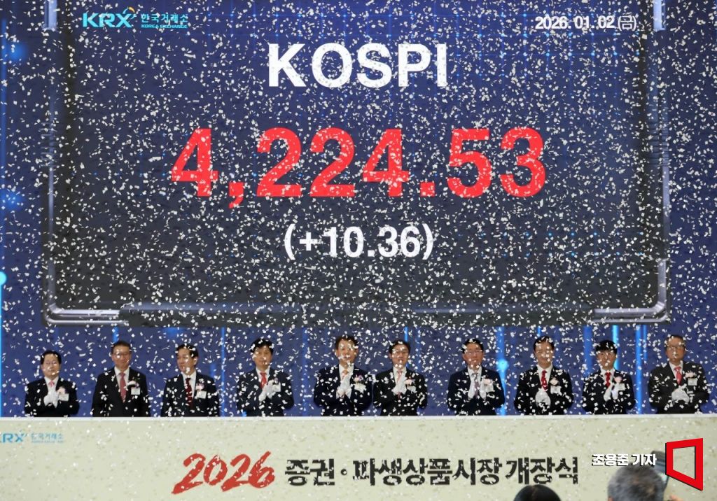 새해 첫 거래일인 2일 코스피가 장중 사상 최고치를 갈아치운 가운데 서울 여의도 한국거래소에서 열린 ‘2026년 증권·파생상품시장 개장식’에서 이억원 금융위원장, 이찬진 금융감독원장, 정은보 한국거래소 이사장 등 내빈들이 코스피 시황판 앞에서 올해 첫 개장을 알리고 있다. 이날 코스피는 10시 12분 기준 전 거래일보다 21.40포인트(0.51%) 오른 4235.57을 기록했다.