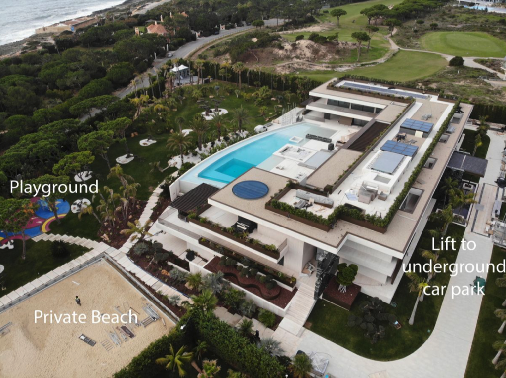 저택 지하에는 약 1200만파운드(약 233억원) 상당의 슈퍼카 컬렉션을 보관할 수 있는 전용 주차장도 마련됐다. 호날두는 가족 중심의 생활도 고려했다. 다섯 자녀를 위한 전용 놀이터와 외부 시선을 철저히 차단한 전용 해변이 갖춰졌으며, 사생활 보호를 위해 저택 인근 골프장 매입까지 검토했을 정도로 보안에 각별히 신경 쓴 것으로 전해진다. 호날두는 이미 리스본 시내 360도 파노라마 뷰의 펜트하우스, 마데이라섬의 7층 저택, 스페인·이탈리아·미국 뉴욕·두바이에 이르기까지 전 세계 주요 도시에 초호화 부동산을 보유 중이다.