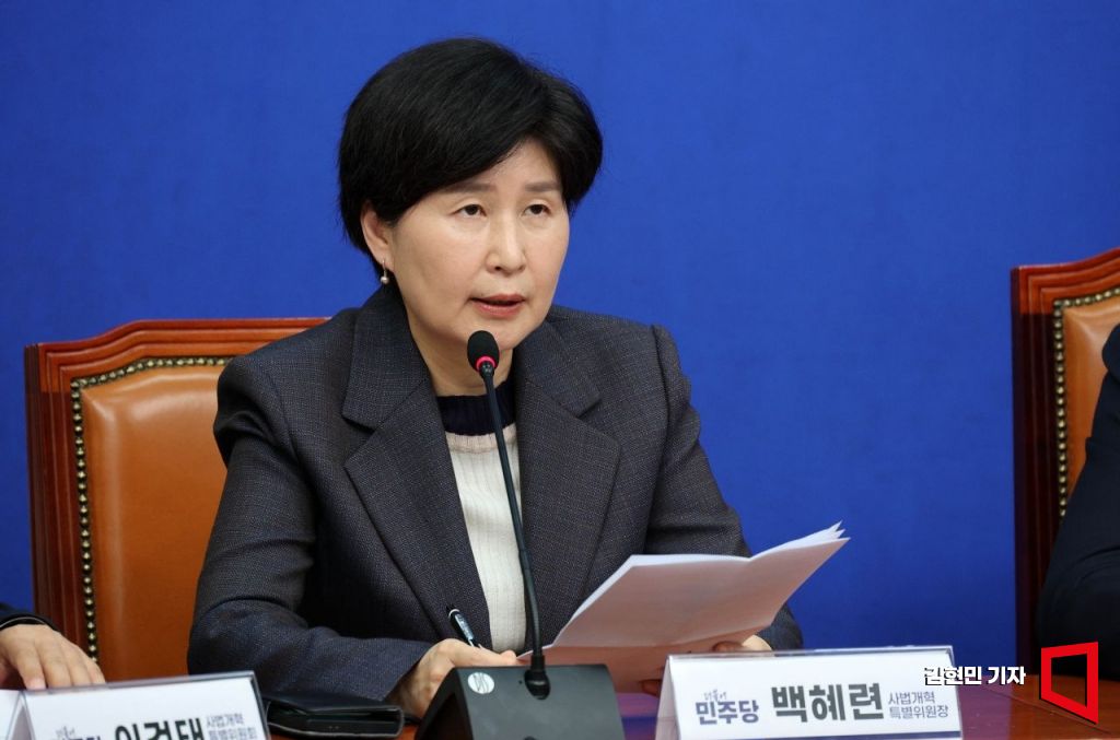 백혜련 더불어민주당 사법개혁 특별위원장이 20일 국회에서 사법개혁특별위원회 사법개혁안을 발표하고 있다. 2025.10.20 김현민 기자