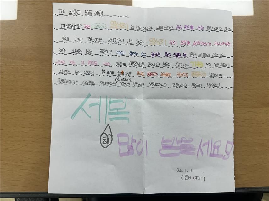 어린이가 직접 쓴 편지에는 "이제 1년이 지났다. 2025년 1년 동안 열심히 우리 모두를 살려주신 거 감사하다. 제가 소방관님들 덕분에 가족과 함께 있고, 즐거운 학교생활 등 좋은 날들이 많다"며 "불 속에 들어가면 뜨겁고 힘든데, 사람들을 힘들게 구하는 일이 멋지다"라는 내용이 담겨 있었다.