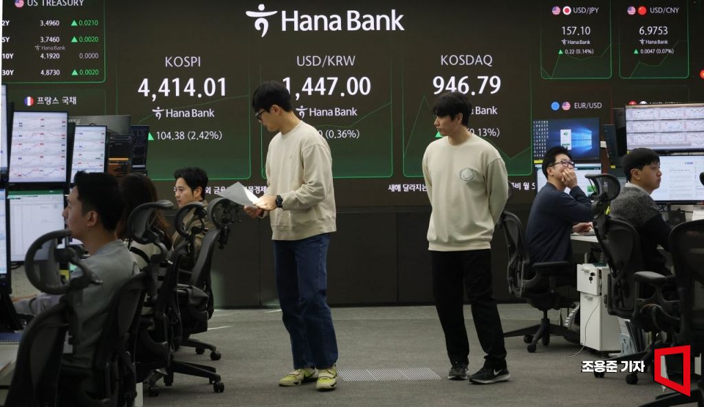 코스피가 또 사상 최고치를 갈아 치운 가운데 5일 서울 중구 하나은행 본점 딜링룸 현황판에 코스피, 원/달러환율, 코스닥 등이 표시돼 있다. 이날 코스피는 전장보다 76.29포인트(1.77%) 오른 4,385.92로 출발해 직전 거래일(2일) 기록한 장중 사상 최고치(4,313.55)를 넘어섰다. 코스닥은 0.43포인트(0.05%) 오른 946.00이다.