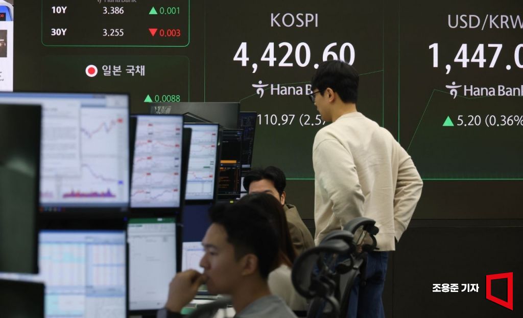 코스피가 또 사상 최고치를 갈아 치운 가운데 5일 서울 중구 하나은행 본점 딜링룸 현황판에 코스피, 원/달러환율, 코스닥 등이 표시돼 있다. 이날 코스피는 전장보다 76.29포인트(1.77%) 오른 4,385.92로 출발해 직전 거래일(2일) 기록한 장중 사상 최고치(4,313.55)를 넘어섰다. 코스닥은 0.43포인트(0.05%) 오른 946.00이다. 2026.1.5 조용준 기자