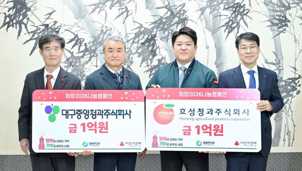 이상윤 대구중앙청과 대표와 김형수 효성청과 대표는 "추운 겨울을 보내고 있는 이웃들에게 조금이나마 보탬이 되길 바란다"며, "앞으로도 단순한 농산물 유통을 넘어 따뜻한 온기를 전하는 상생의 파트너로서 역할을 다하겠다"고 말했다.
