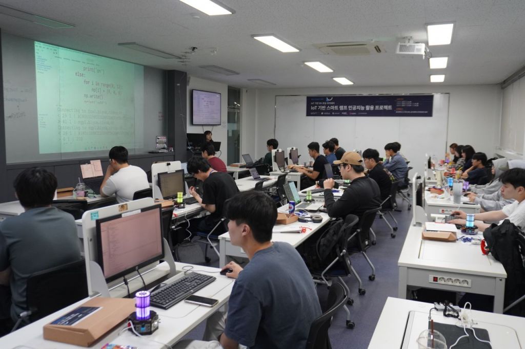 IoT 기반 스마트 램프 인공지능 활용 프로젝트에 집중하는 동서대 학생들.