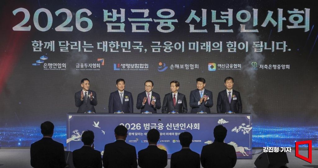 김준 생명보험협회 전무와 정완규 여신금융협회장, 조용병 은행연합회장, 황성엽 금융투자협회장, 오화경 저축은행중앙회장, 오홍주 손해보험협회 전무(왼쪽부터)가 5일 오후 서울 중구 롯데호텔에서 열린 '2026 범금융 신년인사회'에 참석해 기념촬영을 하고 있다.