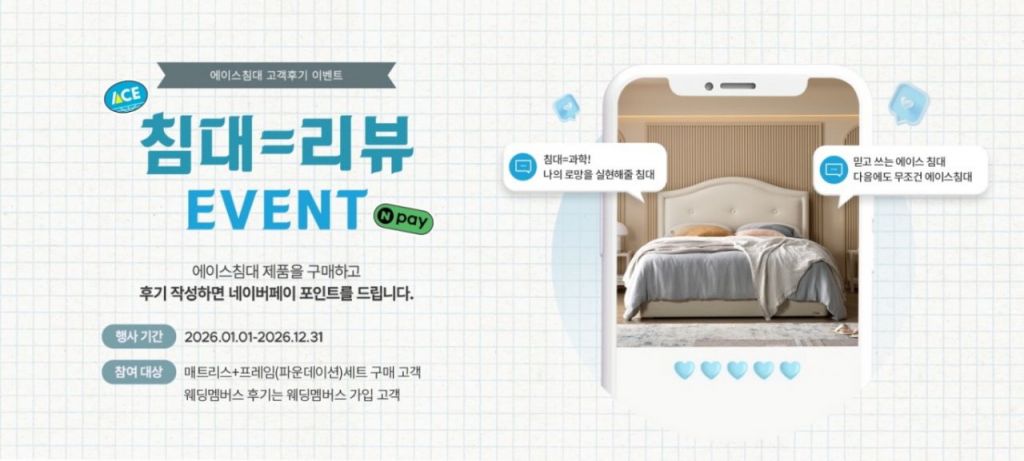 에이스침대가 제품 사용 후기를 작성하면 네이버페이 포인트를 지급하는 '2026 에이스침대 구매 후기 이벤트'를 연간 운영한다. 에이스침대