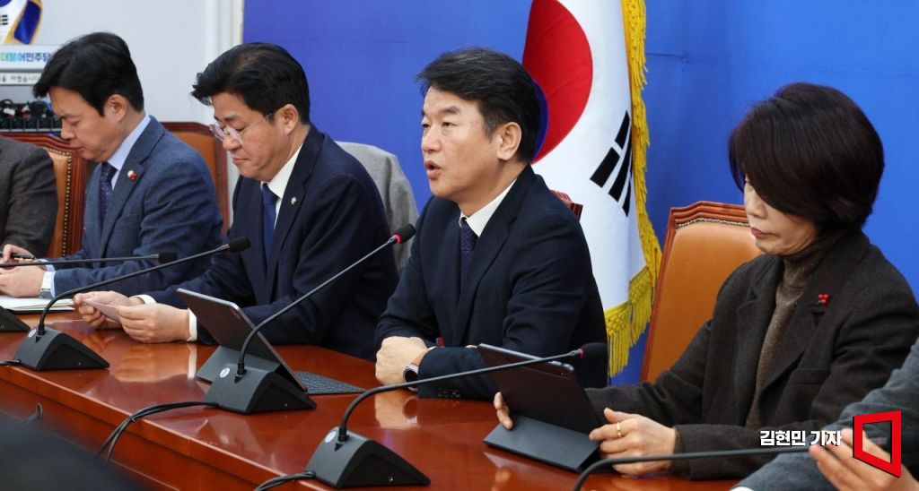 문진석 더불어민주당 원내대표 직무대행이 6일 국회에서 열린 원내대책회의에서 발언하고 있다.