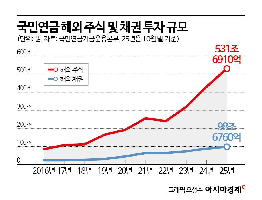 이 총재는 국민연금이 해외 투자 규모를 줄이는 방향으로 자산 배분 전략을 변경할 필요도 있다고 봤다. 이미 큰 손이 된 국민연금의 해외 투자 확대가 원화 약세 요인으로 작용하며 다른 경제 주체뿐 아니라 국내시장 자체에도 영향을 주면서 시장 위축을 불러올 수 있다는 이유에서다. 국민연금기금운용본부에 따르면 2025년 10월 말 기준 국민연금 기금의 해외주식 투자 규모는 531조7000억원으로, 전체 기금 적립금(1427조7000억원)의 37.2%를 차지하고 있다. 해외채권 투자 규모는 98조7000억원으로, 전체의 6.9% 수준이다.