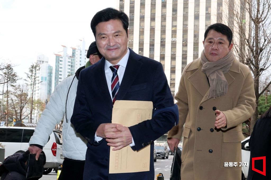 김태우 전 강서구청장이 6일 서울 마포구 서울경찰청 공공범죄수사대로 고발인 조사를 받기 위해 출석하고 있다. 김 전 구청장은 강선우 의원을 공직선거법 위반, 특정범죄가중처벌법 위반(뇌물), 청탁금지법 위반 혐의로 고발했다.