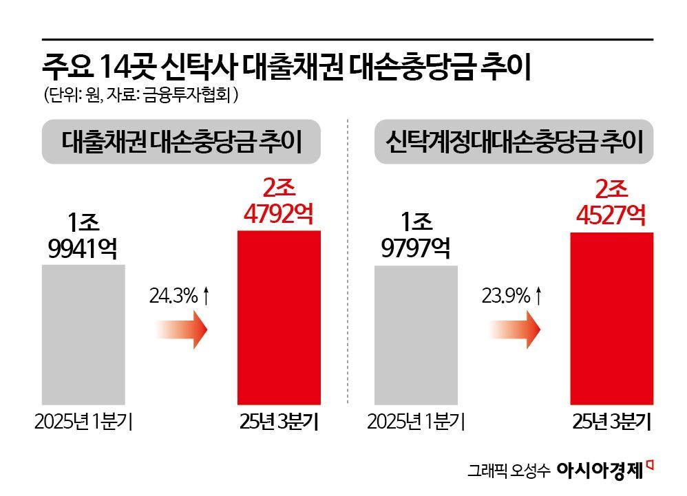7일 금융투자협회 자료를 집계한 결과 부동산 신탁사 14곳의 지난해 3분기 기준 대출채권에 대한 대손충당금은 2조4792억원을 기록했다. 같은 해 1분기 1조9941억원과 비교할 때 24.3% 급증했다. 대출채권에 대한 대손충당금은 신탁사가 대여해 준 자금 가운데 되돌려 받지 못할 가능성이 있는 금액을 미리 손실로 인식한 액수를 의미한다. 대손충당금이 늘어난다는 것은 신탁사가 보유한 채권 가운데 회수 가능성이 낮은 채권 규모가 갈수록 커지고 있다는 의미다.