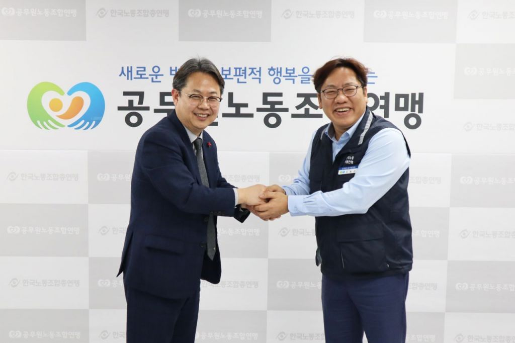 김성훈 인사처 차장과 신동근 공무원연맹 위원장(사진 오른쪽)이 인사를 나누고 있다. 공무원연맹 제공.