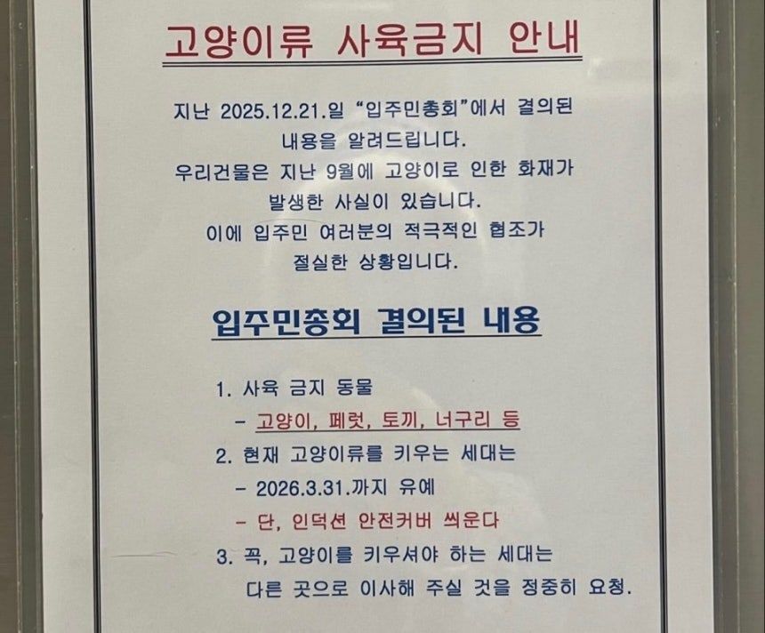 관리실 측은 지난해 9월 고양이와 관련된 화재 사고가 발생한 점을 언급하며 입주민 안전을 위한 협조 차원이라고 설명한 것으로 전해졌다.