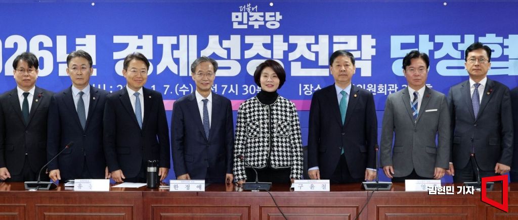 한정애 더불어민주당 정책위의장(왼쪽 다섯 번째)과 구윤철 경제부총리 겸 기획재정부 장관(왼쪽 여섯 번째), 김영훈 고용노동부 장관(왼쪽 일곱 번째)을 비롯한 참석자들이 7일 국회 의원회관에서 열린 2026년 경제성장전략 당정협의에 앞서 기념촬영을 하고 있다.