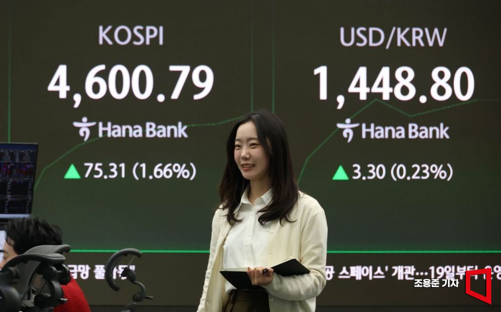 코스피가 연일 사상최고가를 갈아치우며 고공행진하고 있는 가운데 7일 서울 중구 하나은행 본점 딜링룸 현황판에 코스피, 원/달러환율, 코스닥 등이 표시돼 있다. 이날 코스피 지수는 전 거래일 대비 40.86포인트(0.90%) 오른 4,566.34에, 코스닥은 1.77포인트(0.19%) 오른 957.74에 개장했다.