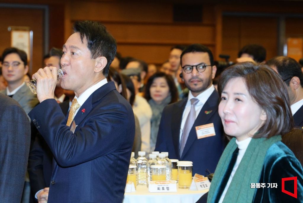 서울시와 서울상공회의소 공동 주최로 7일 서울 중구 대한상공회의소에서 '서울시 신년인사회'가 열렸다. 행사에 참석한 나경원 의원과 나란히 선 오세훈 서울시장이 갈증이 나는듯 물을 마시고 있다.