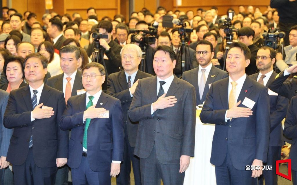 서울시와 서울상공회의소 공동 주최로 7일 서울 중구 대한상공회의소에서 '서울시 신년인사회'가 열렸다. 행사에 참석한 최태원 상의 회장과 오세훈 서울시장 등 주요 참석자들이 국민의례를 하고 있다.
