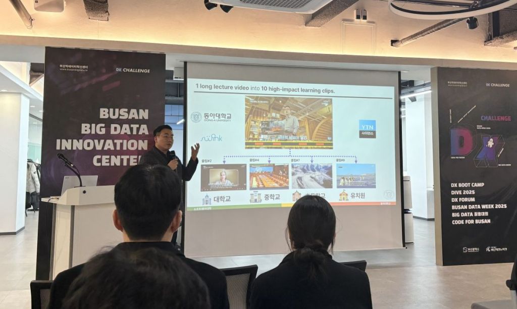 동아대 컴퓨터공학과 천세진 교수가 부산 빅데이터 이노베이션 센터에서 열린 성과보고회에서 프로젝트 내용을 설명하고 있다. 동아대 제공