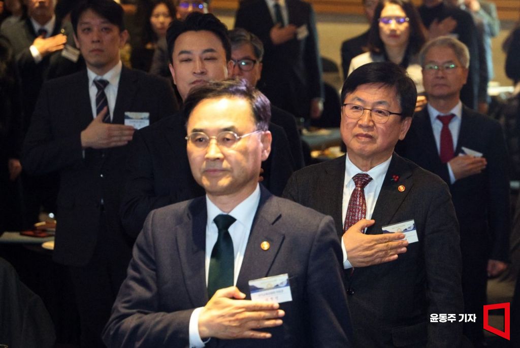 7일 서울 영등포구 FKI타워에서 열린 '교육계 신년교례회'에 참석한 최교진 교육부 장관과 차정인 국가교육위원회 위원장, 강주호 교총 회장 등 주요 참석자들이 국민의례를 하고 있다.