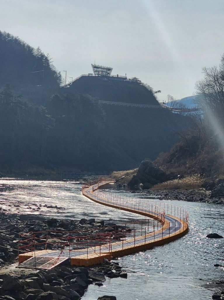 '한탄강 주상절리 가람길'은 수면 위를 따라 걷는 부교(플로팅 브릿지)로, 기존 전망 위주의 관람에서 벗어나 주상절리 협곡을 보다 가까이에서 경험할 수 있도록 기획된 동절기 관광 콘텐츠다. 방문객은 물 위를 걸으며 한탄강의 현무암 협곡과 주상절리 절경을 눈높이에서 감상하고, 한탄강이 지닌 지질학적 가치와 경관의 특징을 체감할 수 있다.