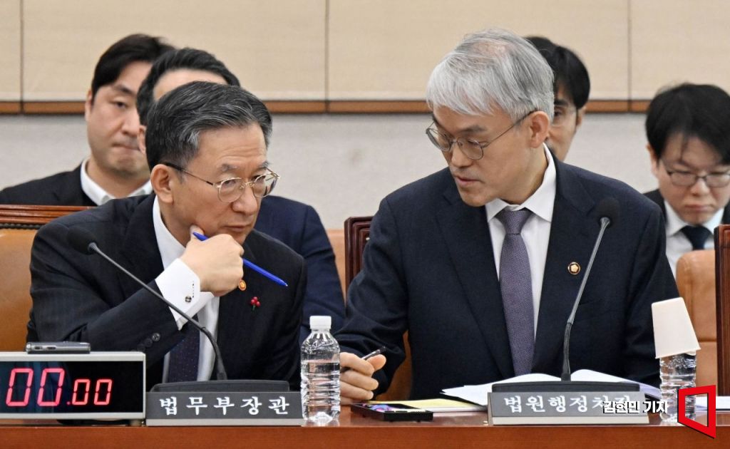 정성호 법무부 장관과 천대엽 법원행정처장이 7일 국회에서 열린 법제사법위원회 전체회의에서 대화하고 있다.