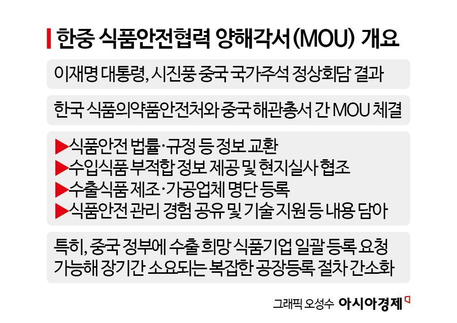 9일 식품업계에 따르면 식품의약품안전처는 최근 중국 해관총서와 식품안전 협력을 중심으로 한 양해각서(MOU)를 체결했다. 이번 MOU에는 식품안전 관련 법·제도 정보 교류, 수출식품 제조·가공업체 등록 절차 간소화, 관리 경험 공유 및 기술 협력 등이 포함됐다. 그동안 중국 수출 과정에서 부담으로 작용해 온 행정 절차가 일부 완화되면서, 수출 여건 자체는 개선될 것이라는 평가다.