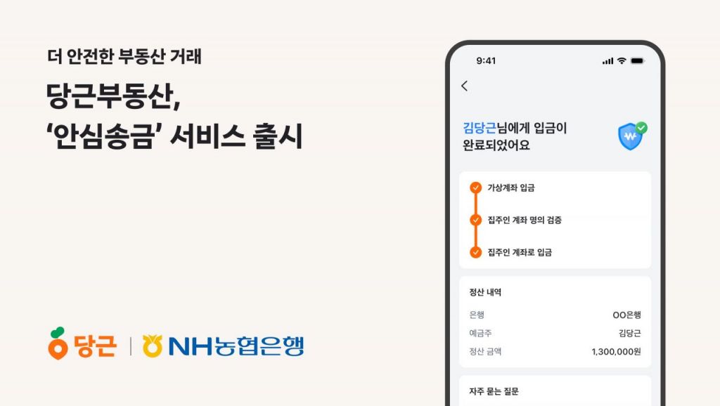 안심송금 서비스는 집주인 인증을 완료한 직거래 매물에만 이용할 수 있다. 집을 사는 구매자가 판매자에게 계약금을 직접 보내는 대신, 당근이 지정한 NH농협은행 가상계좌로 먼저 입금이 진행되는 시스템을 채택했다.