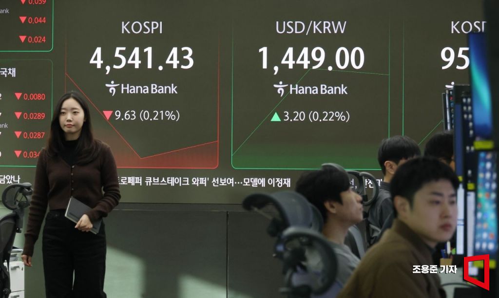 코스피가 하락 출발, 등락을 거듭하며 숨고르기를 하고 있는 8일 서울 중구 하나은행 본점 딜링룸 현황판에 코스피, 원/달러환율, 코스닥 등이 표시돼 있다. 이날 코스피는 전장보다 19.60p(0.43%) 내린 4,531.46로 원/달러 환율은 전장보다 3.9원 오른 1,449.7원으로 시작했다.