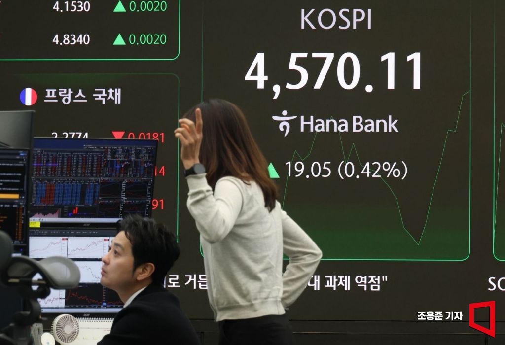 코스피가 하락 출발했지만 9시 50분 현재 1% 가까이 상승세를 이어가고 있는 8일 서울 중구 하나은행 본점 딜링룸 현황판에 코스피, 원/달러환율, 코스닥 등이 표시돼 있다. 이날 코스피는 전장보다 19.60p(0.43%) 내린 4,531.46로 원/달러 환율은 전장보다 3.9원 오른 1,449.7원으로 시작했다. 2026.1.8 조용준 기자