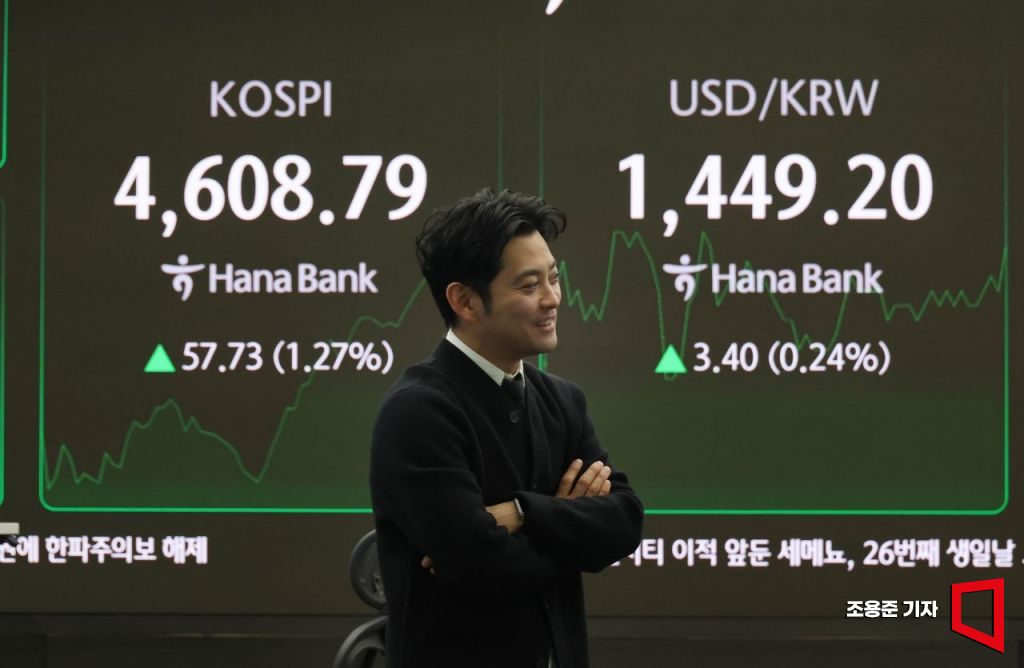 코스피가 하락 출발했지만 10시 5분 현재 4600선을 재돌파한 8일 서울 중구 하나은행 본점 딜링룸 현황판에 코스피, 원/달러환율, 코스닥 등이 표시돼 있다. 이날 코스피는 전장보다 19.60p(0.43%) 내린 4,531.46로 원/달러 환율은 전장보다 3.9원 오른 1,449.7원으로 시작했다.