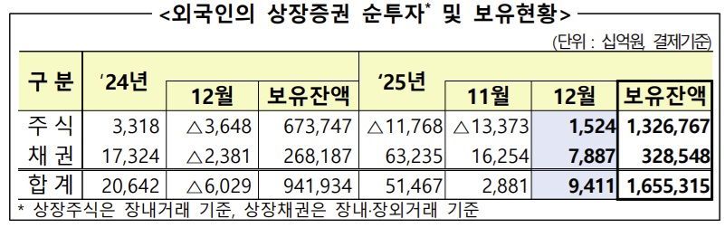 9일 금융감독원이 발표한 '12월 외국인 증권투자 동향'에 따르면 결제기준 외국인은 작년 12월 상장주식 1조5240억원을 순매수했다. 코스피에서 1조6730억원을 사들였으며 코스닥에서는 1490억원을 순매도했다.