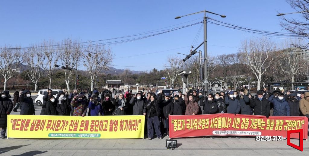 8일 서울 종로구 다시세운광장에서 세운4구역 주민대표회의 등 세운지구 일대 주민들이 국가유산청의 시뮬레이션 실증 촬영 불허와 관련해 입장발표를 하고 있다.