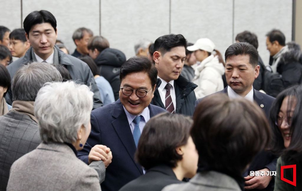 8일 서울 중구 은행회관에서 시민사회단체 신년하례회가 열렸다. 행사에 참석한 우원식 국회의장이 다른 참석자들과 함께 돌아가며 새해 인사를 하고 있다.