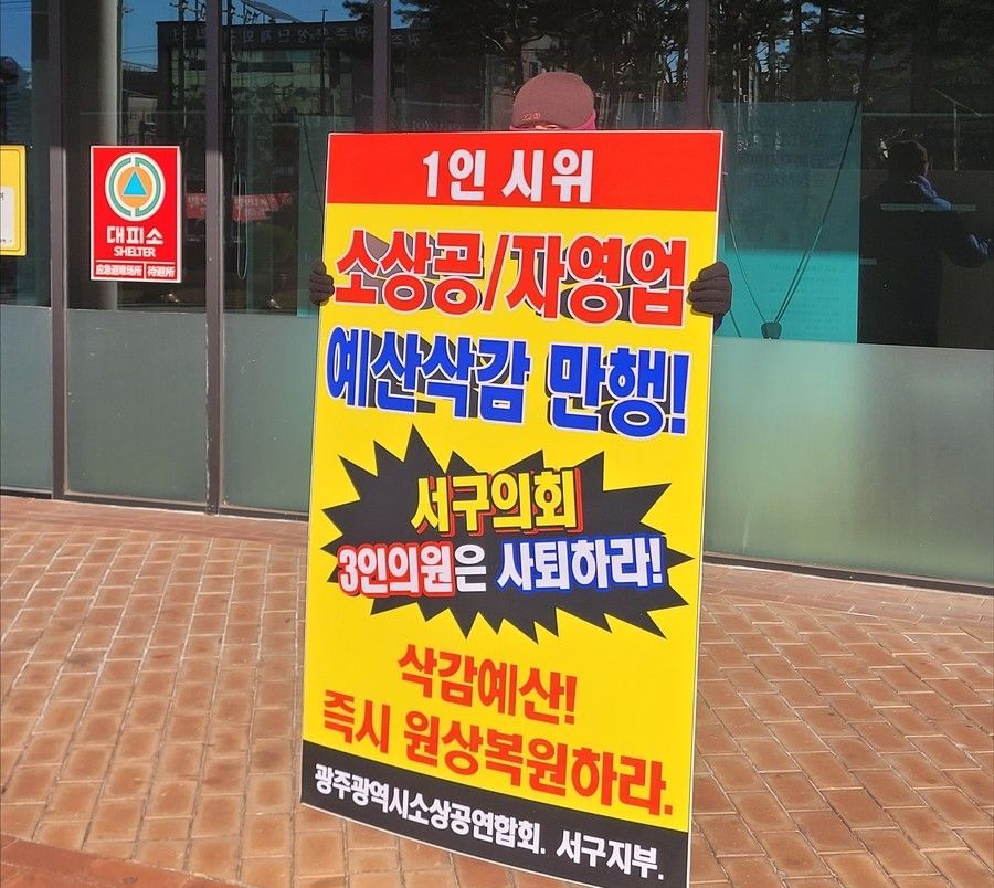 광주소상공인연합회는 8일 광주 서구의회 앞에서 골목페이 예산 삭감을 주도한 구의원들을 규탄하는 피켓시위를 벌였다.