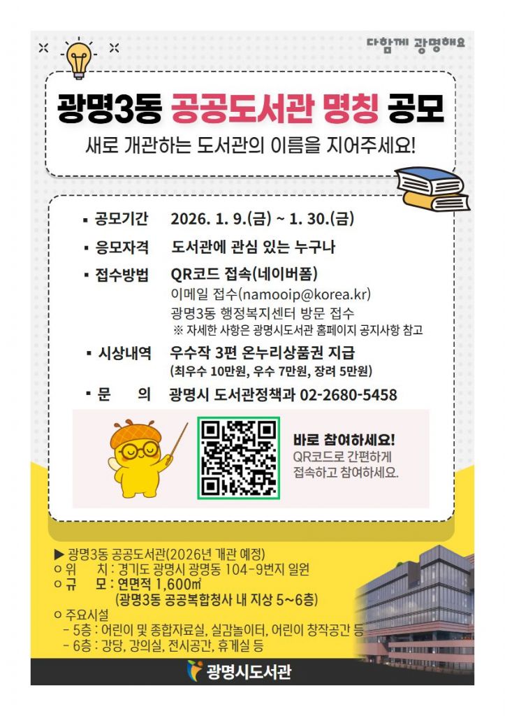 경기도 광명시는 오는 10월 개관 예정인 광명3동 공공도서관의 명칭을 9일부터 오는 30일까지 공모한다.