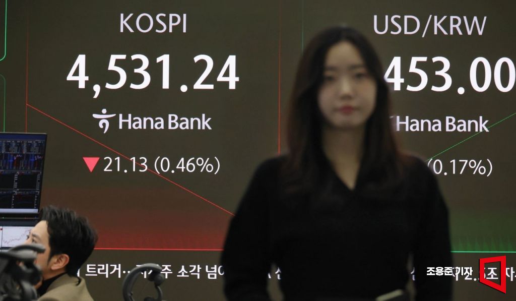 9일 서울 중구 하나은행 본점 딜링룸 현황판에 코스피, 원/달러환율, 코스닥 등이 표시돼 있다. 이날 코스피는 전장보다 22.34포인트(0.49%) 내린 4,530.03으로 출발해 하락폭을 키우고 있다.