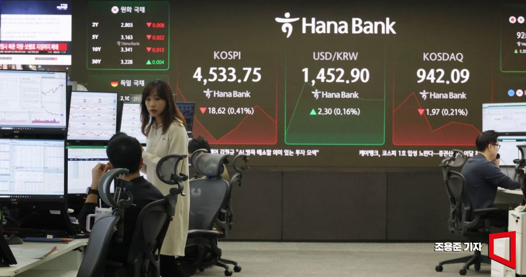 9일 서울 중구 하나은행 본점 딜링룸 현황판에 코스피, 원/달러환율, 코스닥 등이 표시돼 있다. 이날 코스피는 전장보다 22.34포인트(0.49%) 내린 4,530.03으로 출발해 하락폭을 키우고 있다.