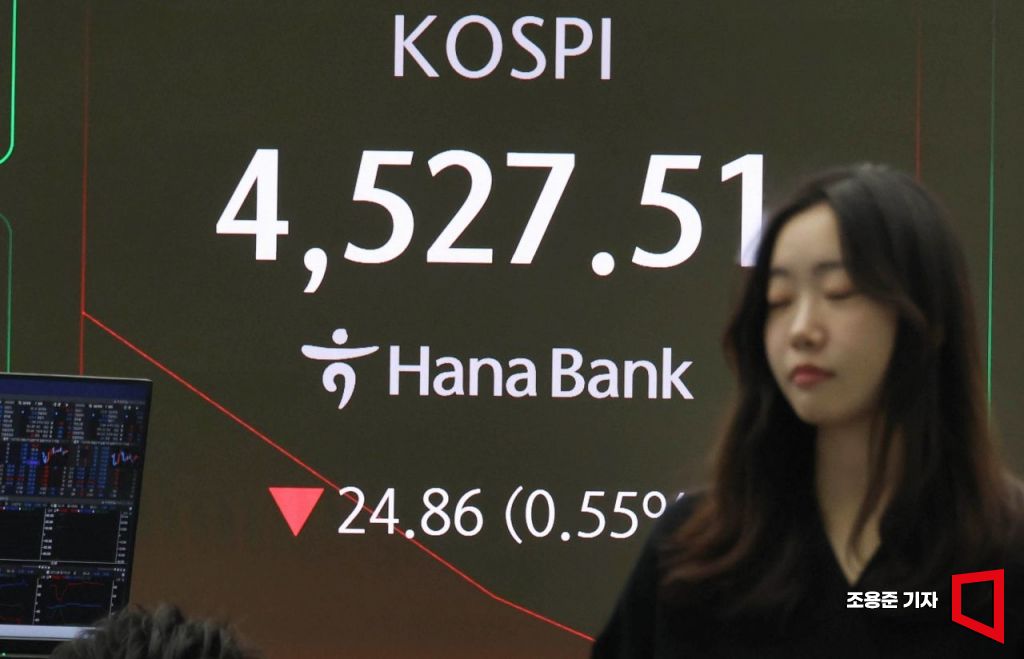 9일 서울 중구 하나은행 본점 딜링룸 현황판에 코스피, 원/달러환율, 코스닥 등이 표시돼 있다. 이날 코스피는 전장보다 22.34포인트(0.49%) 내린 4,530.03으로 출발해 하락폭을 키우고 있다.